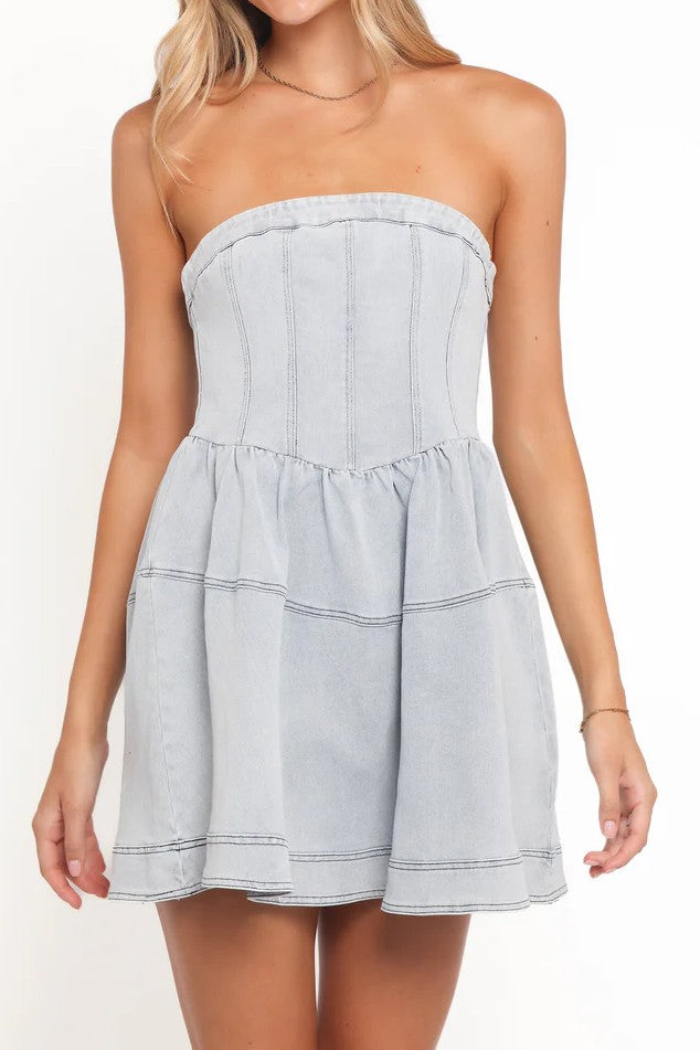 denim mini dress strapless design straight neckline inner bust rubber grip back shirred panel silver...